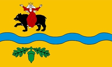 Flaga powiatu Tomaszowskiego wykonana w skali 5:8. Druk na dzianinie poliestrowej o gramaturze 125g/mkw. Wykończona według życzeń Klienta.